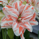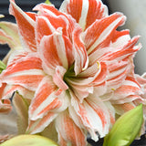 Elegant and theatrical, Hippeastrum Dancing Queen is a striking double-flowering variety known for its crisp colouring and dramatic form. Large, layered blooms open in clean white, boldly edged and brushed with vibrant red. Multiple rows of petals create a full, ruffled flower, with the red markings giving each bloom movement and flair...true to its name.