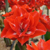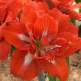 Bold and luxurious, Hippeastrum Happy Nymph is a double-flowering variety with richly layered blooms in deep red tones. Large, ruffled flowers open with multiple rows of velvety red petals, sometimes accented by subtle lighter highlights toward the centre, but always reading as a strong, насыщ red overall.