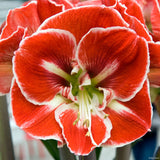 Samba is bold and energetic, with large single blooms in rich red highlighted by a bright white star and edging. Slightly ruffled petals and a green-toned throat add texture and movement.