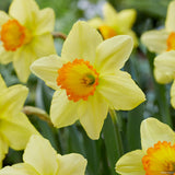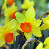 Daffodil 'Red Devon' is a mid-season flowering Daffodil with large, lemon-yellow blooms (11cm wide!), adorned with a glowing orange cup.