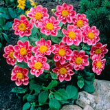 Collarette Dahlias with a single row of flat petals and a collar of shorter florets, which surround decorative centre balls. Adored by bees. Plant the tubers with the main growing tips just below the surface of the soil. Firm the soil around the tubers, being careful not to damage them.