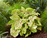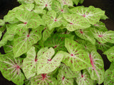 š§ Caladium 'Miss Muffet' is a petite powerhouse of charm, bringing playful elegance to shaded spaces. This strap-leaf variety features lime-green, heart-shaped leaves sprinkled with burgundy freckles and traced with white to pinkish veinsālike confetti tossed across a spring-green canvas.