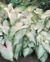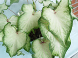 🕊️ Caladium 'White Wing' is a graceful, lance-leaf variety that brings crisp elegance to shaded borders and containers. Its elongated, heart-shaped leaves are predominantly white, accented by reddish-pink veins and clean green margins, giving it a feathered, angelic look—hence the name.