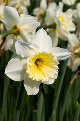 Large 9.5cm across blooms of creamy white petals, adorned by frilly lemon yellow cups - as the flower ages, the cups turn from faded yellow to creamy white.