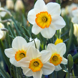 Lightly fragranced Daffodil Flower Record has pure white outer petals that frame a large, gently ruffled golden yellow cup, edged in warm orange.