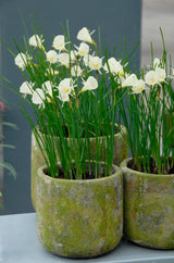 Daffodil bulbocodium White Petticoat is a special spring flowering plant with hoop petticoat-shaped flowers and grassy foliage.