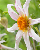 Striking new star-shaped dahlia with a light scent and pure white petals tinged pink on the edge.
