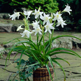 Crinum Powellii Album - These lovely spidery trumpets sit high on 80-90 cm stems with each stem producing around 8-12 flowers, making a lovely cutflower. Plant the bulbs with the neck of the bulb protruding the surface of the soil, and 10-15 cm apart