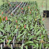 The slim, grey-green leaves grow high on the stem and are crowned by numerous vibrant red, drooping, bell-shaped blossoms, frequently with yellow markings on the inside. This sleek, pale green plant features most of its leaves near the center of the stalk a