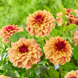 Dahlia 'Creme de Cognac' is a decorative dahlia known for its unique, warm-toned blooms. The petals display a blend of peach, copper, and rusty red hues, often with a deeper raspberry or burgundy colour on the underside and at the center.