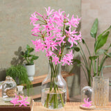Nerine blooms as a cluster of flowers on a leafless stem. Each flower is trumpet-shaped with recurved petals. Nerines are the perfect cut flower.