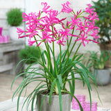 Nerine blooms as a cluster of flowers on a leafless stem. Each flower is trumpet-shaped with recurved petals. Nerines are the perfect cut flower.