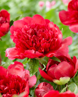 The double-flowered Many Happy Returns attracts attention with its bright red, large flowers that can easily grow to be 17 cm in diameter. This variety has characteristics of both the anemone type and the bomb type of peonies.