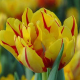 Monsella Tulips are a lovely long lasting Peony type variety - double rows of bright canary-yellow petals feathered with red stripes.