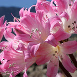 The large clusters of scented, trumpet-shaped pink flowers are carried on a long purplish-red and green stem appearing 50cm above the soil. Up to twelve flowers are produced from the flowering stem.