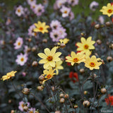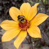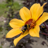Dahlia ‘Bishop of York’ is a single-flowered dahlia that glows with golden warmth and moody contrast. Its bright yellow blooms—simple, open-faced, and rich in nectar—stand out dramatically against deep burgundy to chocolate-purple foliage, making it a magnet for bees and butterflies and a visual standout in any border.