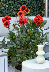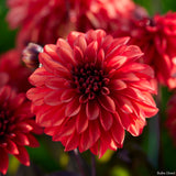 Dahlia ‘Cool Flame’ is a decorative dahlia that brings a bold, warm glow to the garden. Its fully double blooms are a rich, fiery red, enhanced by dark stems that add a touch of drama and contrast. The flowers have a classic rounded form and a velvety texture that makes them irresistible in both borders and bouquets.