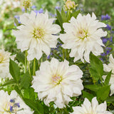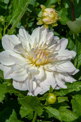 Dahlia ‘Iceberg’ is a dinnerplate decorative dahlia that brings cool elegance to the garden with its massive white blooms, subtly tinged with lavender near the center petals. The flowers are soft and rounded, creating a serene, snow-like effect that glows beautifully in sunlight.