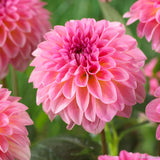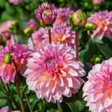 Dahlia ‘Esli’ is a decorative dahlia that radiates vintage charm with its soft pink blooms and a subtle yellow blush at the center. As the flowers mature, they often fade to a lighter pink, giving each bloom a delicate, evolving beauty. The petals are broad and flat, arranged in a full, rounded form that’s both classic and eye-catching.