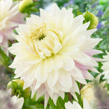 Dahlia ‘Kiev’ is a dinnerplate decorative dahlia that exudes quiet sophistication with its creamy white blooms, which gradually develop a soft rose-pink blush as they mature. The petals are slightly rolled under at the edges, giving the flowers a subtle spiky texture that adds depth and movement.