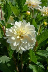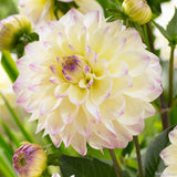 Dahlia ‘Lake Carey’ is a decorative dahlia that glows with soft elegance and pastel charm. Its blooms are a gentle blend of creamy yellow petals with flashes of soft pink at the tips, creating a watercolour effect that feels serene and romantic. The rounded form and subtle colouration make it a favourite for bouquet work and cottage-style borders.