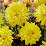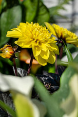 Dahlia ‘Meteorite’ is a decorative dahlia that lights up the garden with its buttercup-yellow blooms set against dark bronzey-green to nearly black foliage—a bold contrast. The flowers are fully double and symmetrical, making them ideal for both borders and bouquets.