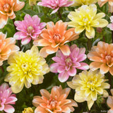Dahlia ‘Orange Perception’ is a waterlily-type decorative dahlia that glows with soft elegance and painterly charm. Its double blooms are a gentle apricot-orange, tipped with ivory white, creating a luminous gradient. The petals are flat and slightly cupped, giving the flower a serene, open-faced appearance.