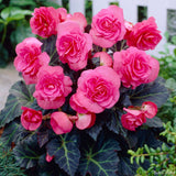 The Dixie Melon Begonia is a standout variety with its large, melon-colored blooms in shades of coral and soft orange, set against deep green, glossy leaves. Its vibrant, tropical look brings will bring a bold splash of colour to any garden or patio.