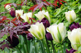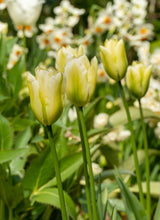 Viridiflora tulips take their name from the green streaks that highlight each petal. Their distinctive shape and unusual colours complement other spring flowers, both in the garden and in bouquets. Viridifloras bloom late in the season and their flowers are extremely long lasting.