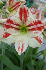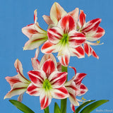 Make a bold statement with Hippeastrum Ambiance, a spectacular amaryllis variety celebrated for its richly coloured, high-contrast blooms. Large, velvety petals open in deep, glowing crimson red, dramatically brushed and edged with luminous white. Subtle streaks and feathering radiate from the centre, giving each flower depth, movement, and a beautifully hand-painted look.