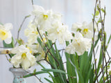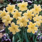 Beautifully ruffled, lemon yellow cups lie almost flat against their impressive white petals. As the blooms mature, their cups fade into a more creamy, almost white tone, similar to the petals behind.