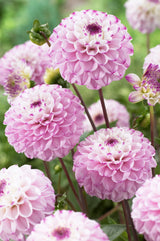Genova Dahlias - perfectly formed balls, each made up of multiple layers of pale mauve petals tipped with regal purple. Very free flowering, tall, strong stems... making this one of our favourite cut-flower varieties.