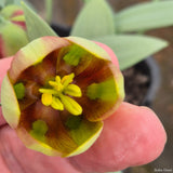 Lovely silvery leaves are carried alternately on 20 cm stems with a cluster of up to three flowers of quite bright, jade green with the inner three petals shaded with caramel coloured chequering.