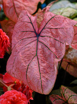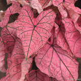 🌸 Caladium 'Spring Fling' is a tropical showstopper that turns up the charm with vivid, heart-shaped foliage. This fancy-leaf variety features hot pink leaves accented by dark green veins and held aloft on nearly black stems, creating a dramatic contrast that pops in both sun and shade.